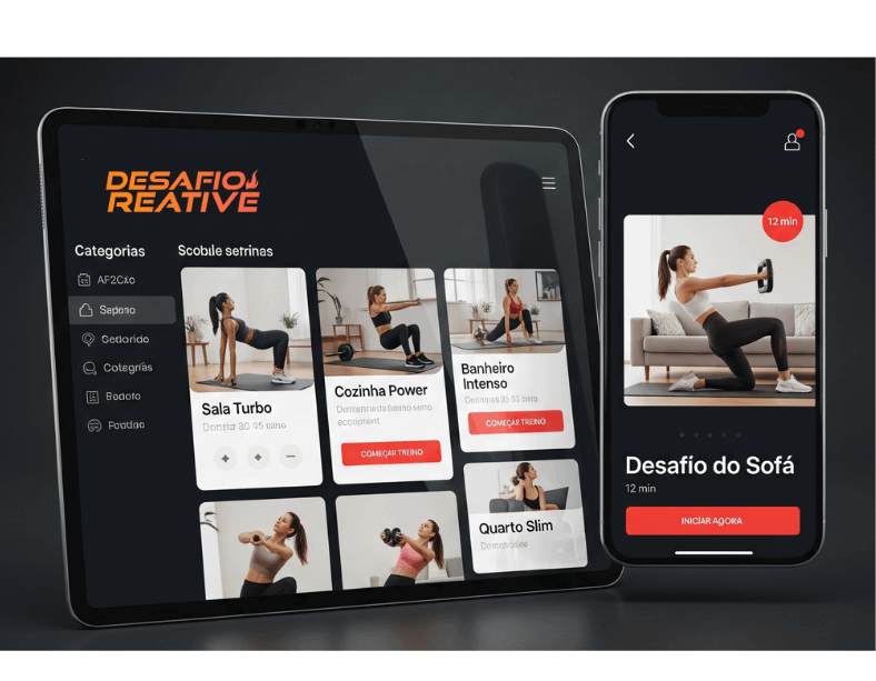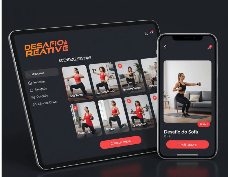 O Desafio Reative é um programa de treinos curtos e eficazes criados para reativar seu metabolismo, acelerar a queima de gordura e devolver sua energia — mesmo que você esteja parada há meses.